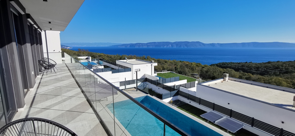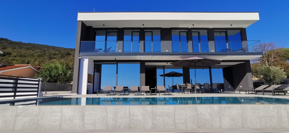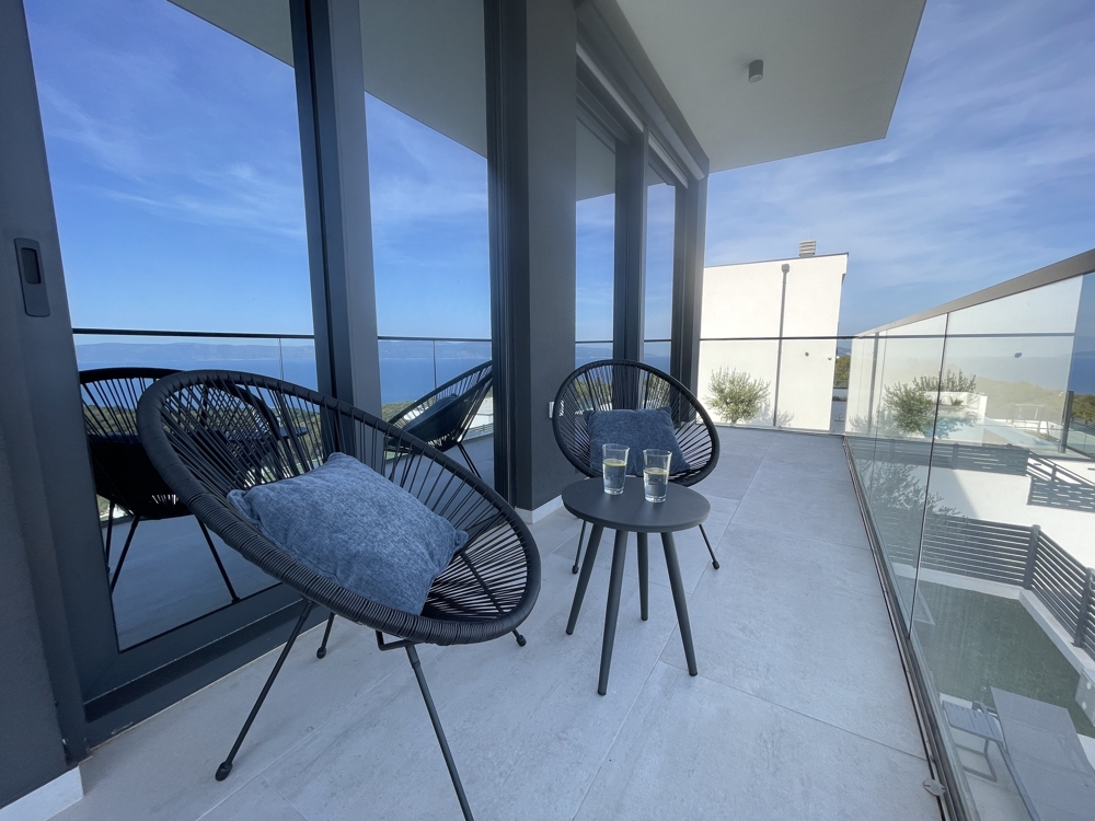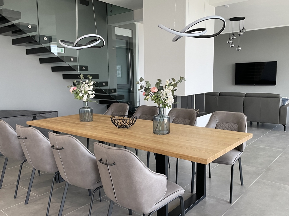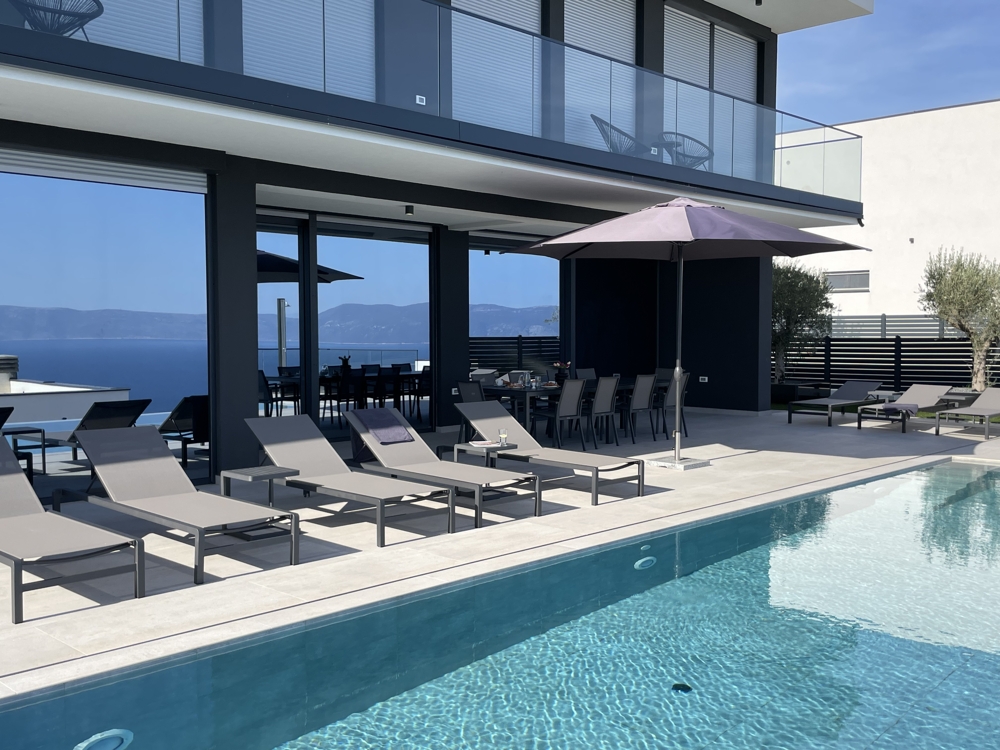 Das lichtdurchflutete Haus beeindruckt mit einer Ausstattung von höchster Qualität. Die elegante Architektur wird durch eine großzügige Terrasse und einen Balkon ergänzt, die ideale Plätze bieten, um warme Sommerabende zu genießen und die atemberaubende Aussicht zu erleben. Der private Pool ist ein weiterer Höhepunkt und verspricht exklusive Erholung und Vergnügen.