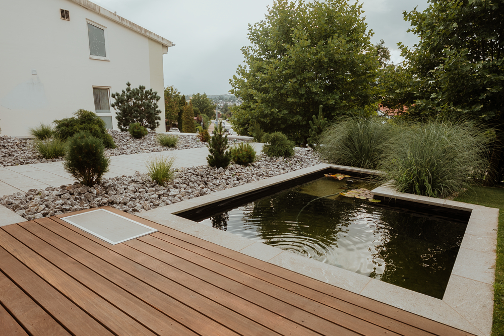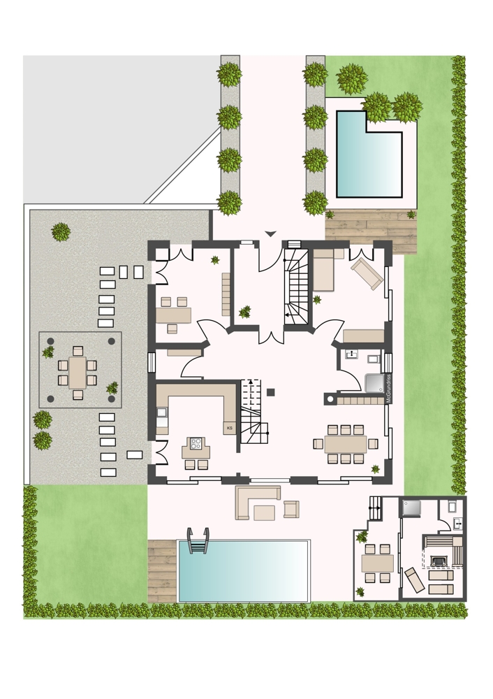 Im Außenbereich erwartet Sie ein gepflegter Garten mit Saunahaus und einem einladenden, beheizbaren Outdoorpool mit Freisitz. Das Saunahaus verfügt über einen Ruhebereich, einen Duschbereich, ein WC und eine Terrasse. Im Garten befindet sich außerdem ein kleiner Teich und eine Pergola, unter der es sich bei netten Grillabenden aushalten lässt.