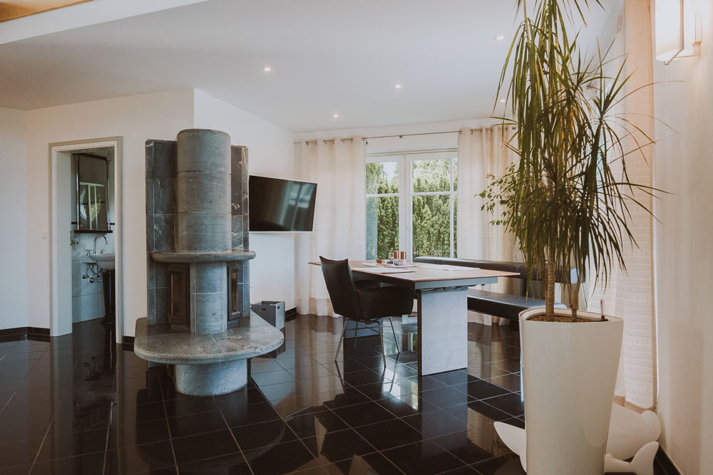Der Essbereich im Erdgeschoss mit einem wunderschönen Schwedenofen ist perfekt für gemütliche Runden mit der Familie und Freunden.